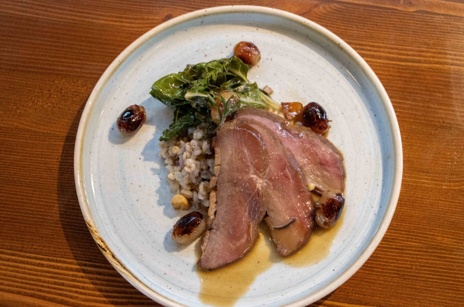 Seared Duck Breast with Toasted Barley, Roasted Grapes, and Rosemary Jus